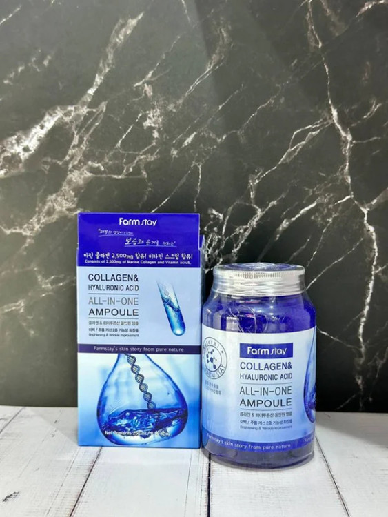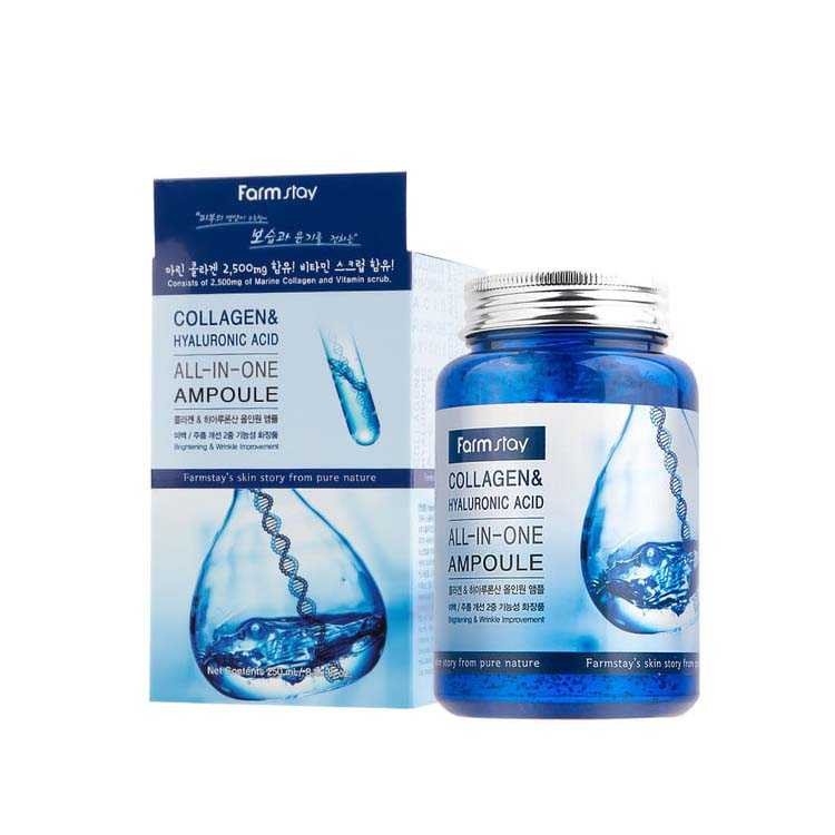 در اندازه فول سایز با حجم 250 میلی لیتر و یک محصول جوانساز و ضد پیری است. این آمپول ترکیبی از دو ماده موثر کلاژن و هیالورونیک اسید بوده و همچنین غنی از ویتامین ها و مواد معدنی و عصاره جوجوبا می باشد. آمپول کلاژن و هیالورونیک اسید آل این وان FarmStay پوست را به خوبی آبرسانی و مرطوب می کند. این محصول به بهبود خطوط و چروک ریز پوستی کمک کرده و از ایجاد علائم پیری پوست جلوگیری می نماید.